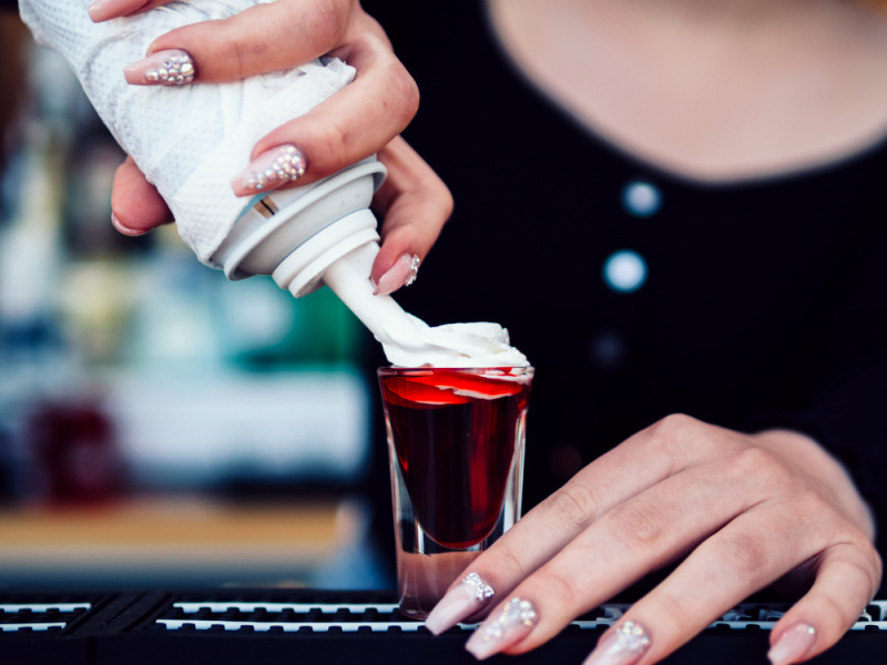 - Аккуратно, с помощью барной ложки, налейте сливочный ликёр поверх кофейного так, чтобы они не смешались.