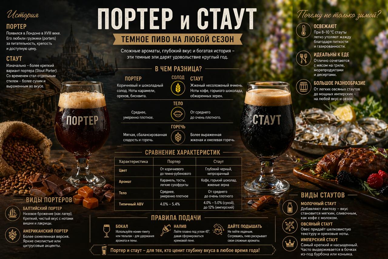 Портер и стаут – это не просто «темное пиво», а целая палитра вкусов: от легкой карамельной сладости до брутальной кофейной горечи. Их можно и нужно пить круглый год, подбирая сорт под настроение, погоду и ужин.