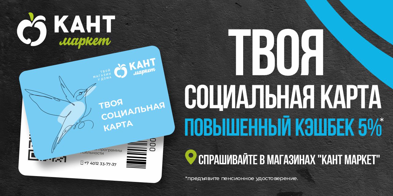 Твоя социальная карта «КАНТ маркет» — это повышенный кэшбек 5% в магазинах на самые необходимые продукты*:
