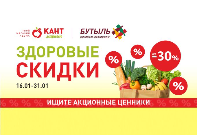 В магазинах у дома «КАНТ Маркет» и «Бутыль» ЗДОРОВЫЕ СКИДКИ на полезные продукты и приятные шалости.